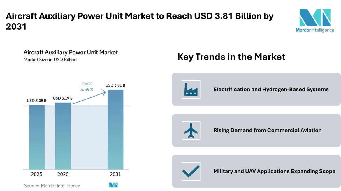 According to the Mordor Intelligence, the aircraft auxiliary power unit market size is expected to grow from USD 3.08 billion in 2025 to USD 3.19 billion in 2026, and further reach USD 3.81 billion by 2031, registering a CAGR of 3.59% during the forecast period. The market is steadily expanding as airlines, defense operators, and aircraft manufacturers adapt to changing operational and environmental requirements.
